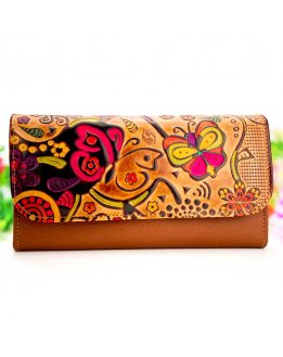 Cartera de piel para mujer color marrón con billetero y monedero interior, originales motivos grabados en la parte frontal pintados a mano Para ampliar la foto pasa el ratón sobre el producto.